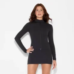 ButterBliss double-zip fashion jacket from Wild Fable™ in a solid shade. Made from interlock fabric blend of recycled polyester and spandex for comfortable, flexible year-round wear. Features a full two-way zipper down the front and mid-length hem. Slim-fit silhouette completes the design with a flattering look.