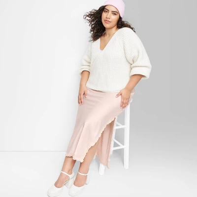 Satin skirt from Wild Fable™ in a solid hue. Made of midweight recycled polyester with a hint of spandex for flexible comfort that moves with you. Tailored in a slim-fit silhouette with a high-rise, pull-on waist. Cut to a midi length and accented with floral lace trim on the hem and the long side slit.