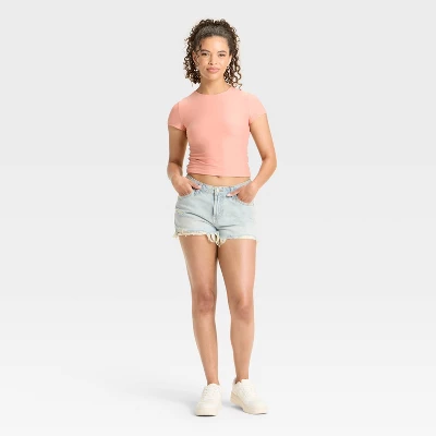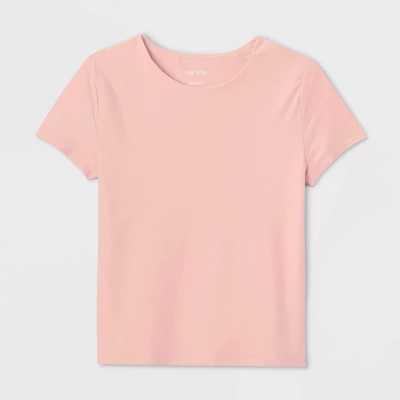 Solid-color T-shirt from Wild Fable™ made from extra-lightweight fabric with spandex. Tailored in a slim-fit silhouette with a cropped length. Boasts a double-layered construction for comfortable wear. A classic crew neckline, short sleeves and pullover style complete the look.